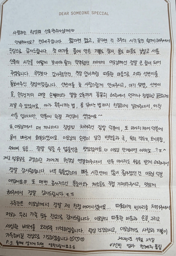 정말 감사했습니다.너무 힘들었는데 빠른시간안에 많이 좋아졌던건 이모님 덕분이었어요.매번 농사지으신 복숭아와 채소들도 직접 가져와 주시고 맛있게 해 주셔서 정말 감사드립니다.